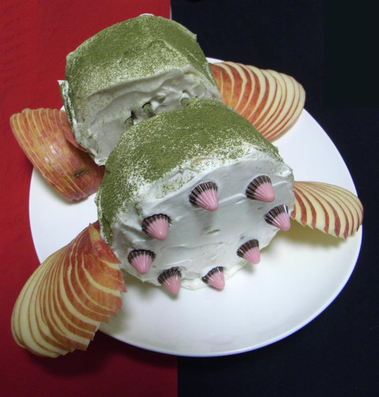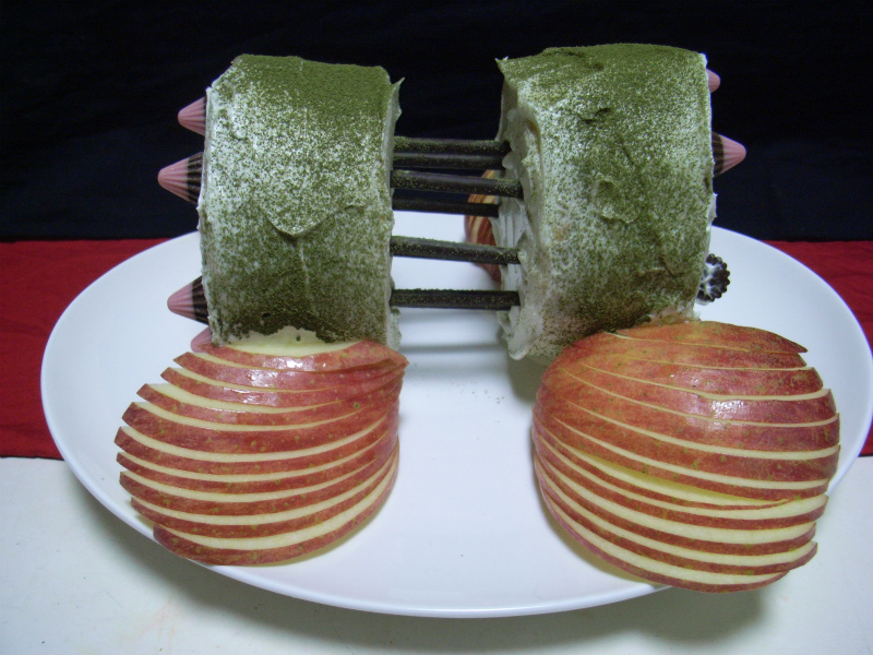 I baked two 12cm-diameter sponge cakes and connected them with Pocky sticks.